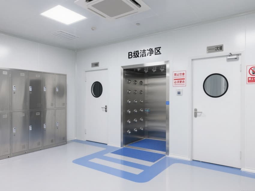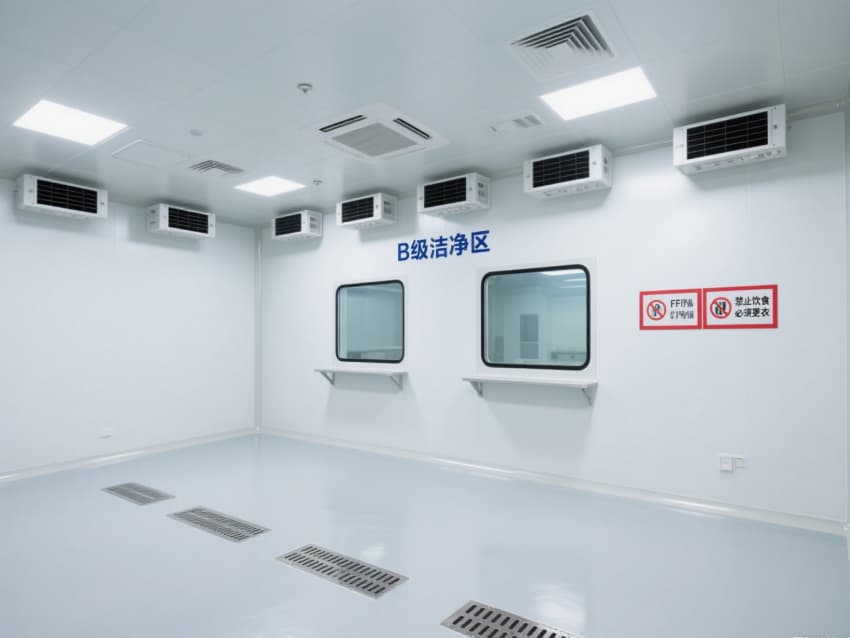 頂部嵌入式高效送風口形成垂直層流,配合側(cè)下回風系統(tǒng)實現(xiàn)每小時15-25次空氣置換,恒溫恒濕系統(tǒng)精準控制溫度(18-26℃)、濕度(45-65%)。不銹鋼潔凈門窗與傳遞窗采用高氣密性密封結(jié)構(gòu),嵌入式LED潔凈燈提供≥300lux均勻照明,全方位營造安全、精準的生物制藥生產(chǎn)基礎(chǔ)環(huán)境。