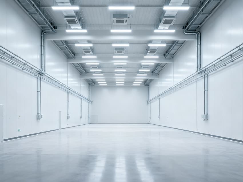 內部6個生產車間均為無設備空曠布局,按工業級潔凈與承重標準建設:地面鋪設耐磨防靜電環氧地坪,墻面采用白色環保潔凈墻板,陰陽角做圓弧處理減少積塵;柱網間距達10米,預留設備安裝與物流通道空間;頂部整合恒溫恒濕新風系統與節能LED照明,管線暗藏于吊頂內,避免空間雜亂;車間之間通過通透玻璃隔斷銜接,進一步強化整體空曠感,為新能源產品規模化生產、柔性產線調整提供高效、潔凈的空間支撐。