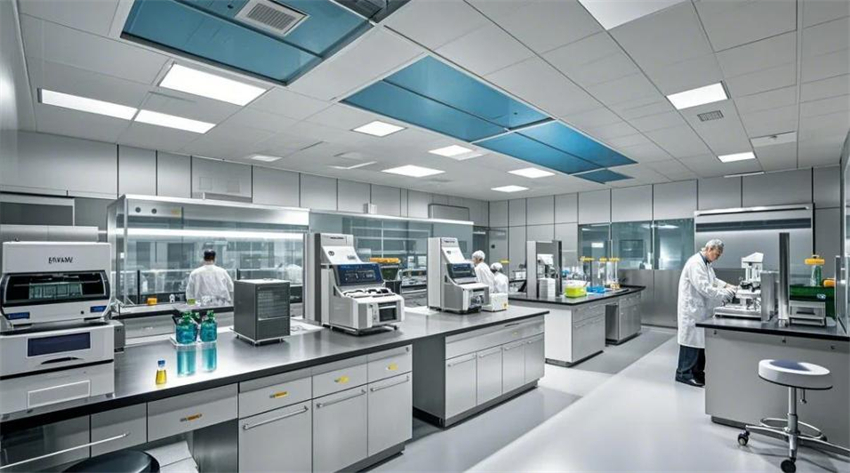 1000平方米生物實驗室整體裝修,現代科技風格,實驗室分為核心實驗區、設備區、樣品存儲區和辦公區。核心實驗區占50%,設備區占30%,樣品存儲區占10%,辦公區占10%。核心實驗區:防靜電環氧地坪(淺灰色),白色彩鋼板墻面和天花板,頂部高效過濾器(HEPA),不銹鋼實驗臺,設備排列整齊。設備區:精密儀器整齊排列,地面為防靜電PVC地板(淺色)。樣品存儲區:冷藏柜和樣品架整齊,溫濕度控制。辦公區:玻璃隔斷,現代簡約辦公桌。整體色彩:白色、淺灰色、科技藍點綴。