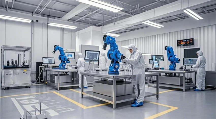 機械人研發實驗室,未來科技風格。實驗室分為研發區、測試區、裝配區和辦公區。研發區占50%,測試區占30%,裝配區占10%,辦公區占10%。研發區:防靜電環氧地坪(淺灰色),白色彩鋼板墻面和天花板,頂部高效過濾器(HEPA),不銹鋼工作臺,機械人原型和3D打印機排列整齊。測試區:機械人測試平臺,地面為防靜電PVC地板(淺色)。裝配區:工具架整齊,機械人部件分類存放。辦公區:玻璃隔斷,現代簡約辦公桌。整體色彩:白色、淺灰色、科技藍點綴。